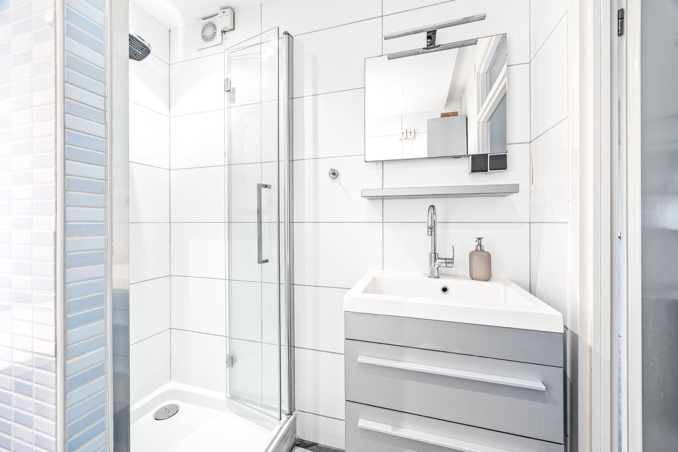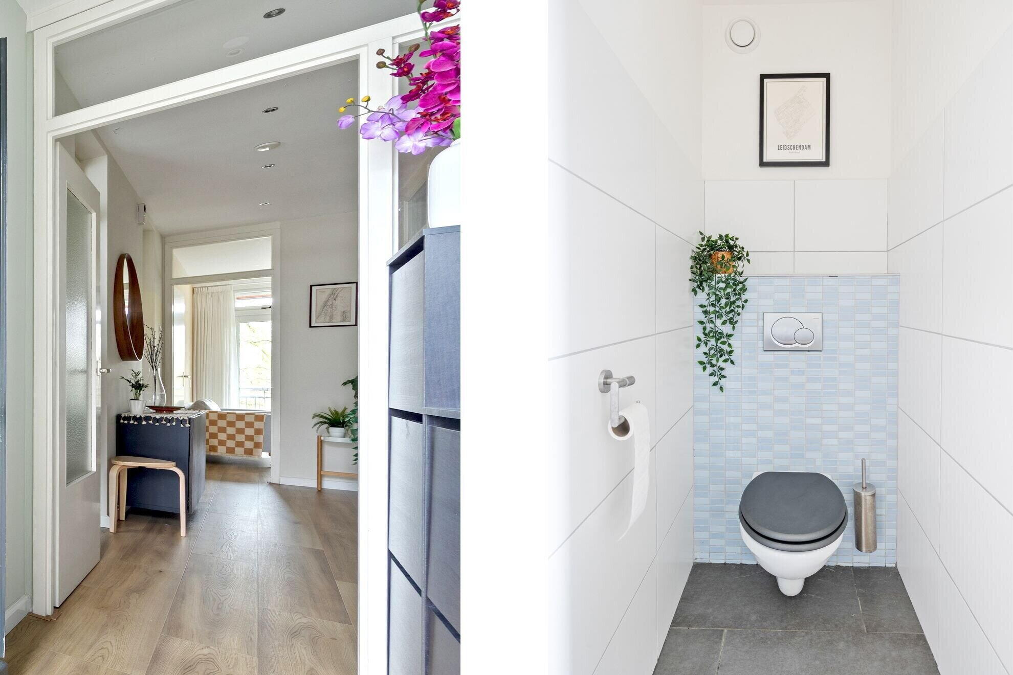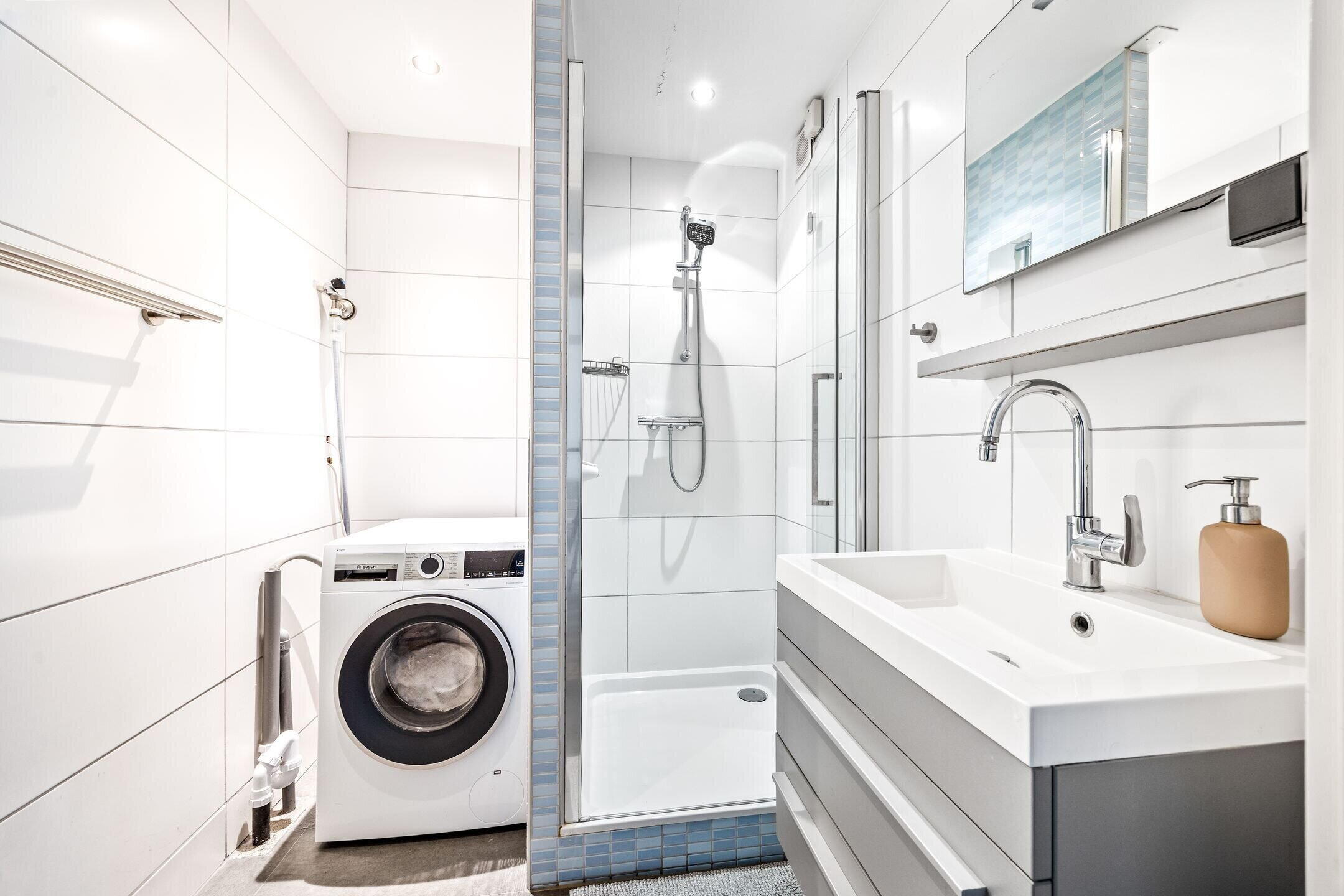 Naast de keuken bevindt zich een modern toilet met vrij hangend closet en hiernaast een eveneens moderne badkamer voorzien van wastafelmeubel en inloopdouche. Tevens bevindt zich in de badkamer de opstelplaats voor de wasmachine en de droger.