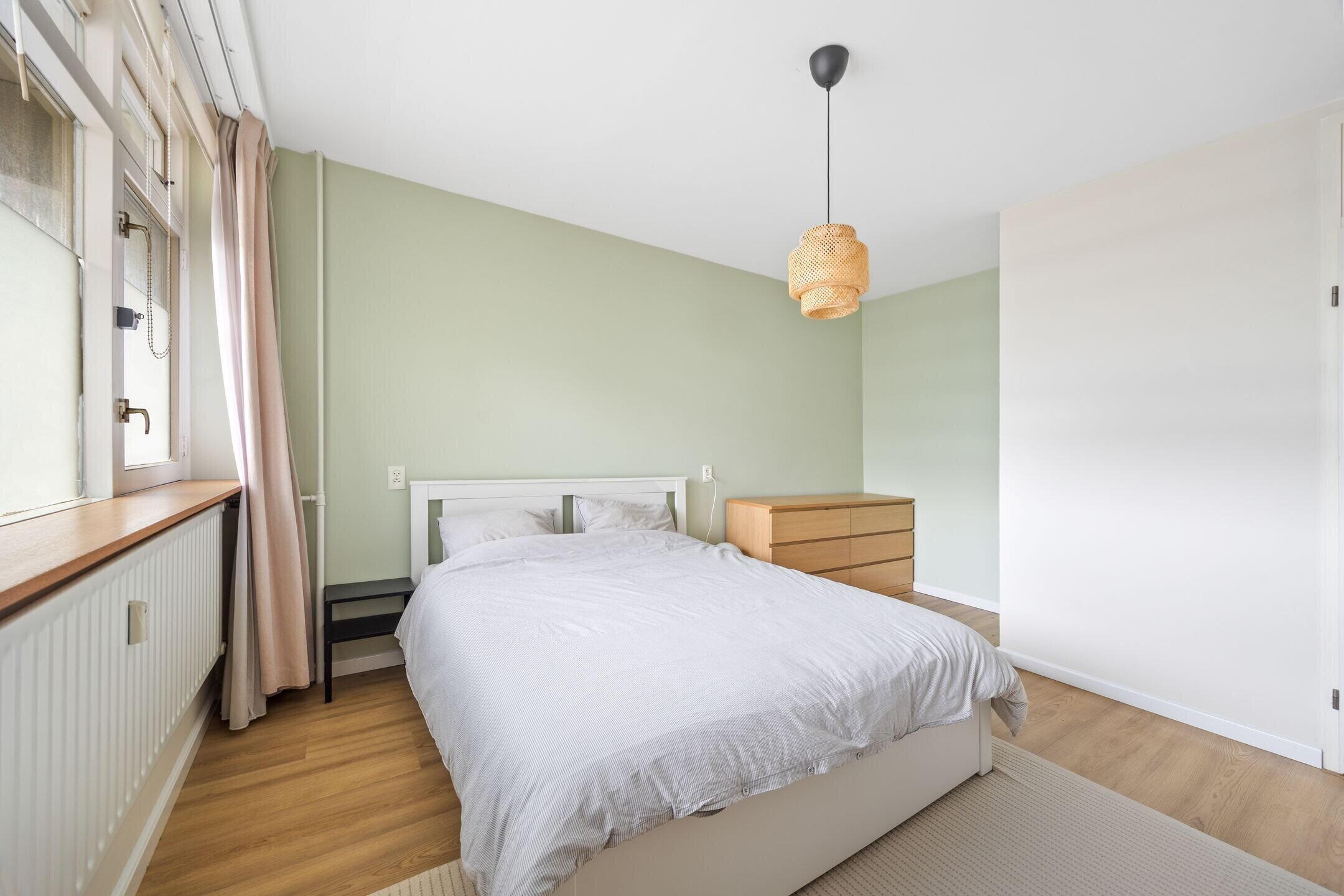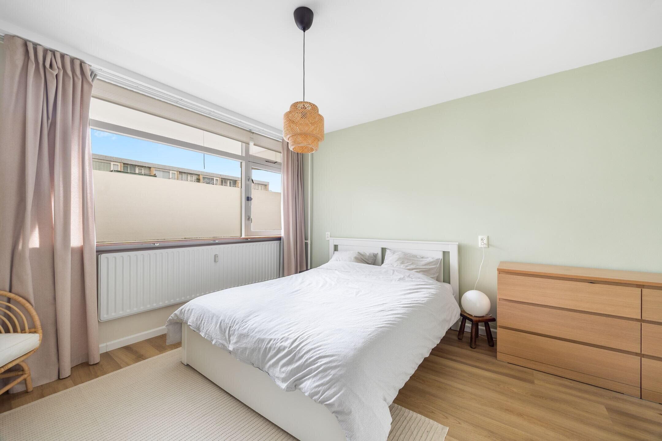 Aan de galerijzijde gelegen, zeer ruime slaapkamer met ruime vaste kast, alwaar zicht tevens de meterkast bevindt (8 groepen met 2 aardlekschakelaars). Aan de rustige achterzijde is de tweede slaapkamer gesitueerd. Deze is eveneens ruim van opzet en is voorzien van een grote garderobekast. In deze kast is ook de opstelplaats voor de (huur-)boiler. Vanuit de achter slaapkamer is het op het zuidwesten gelegen, zonnige balkon te bereiken, dat uitkijkt over een parkje.