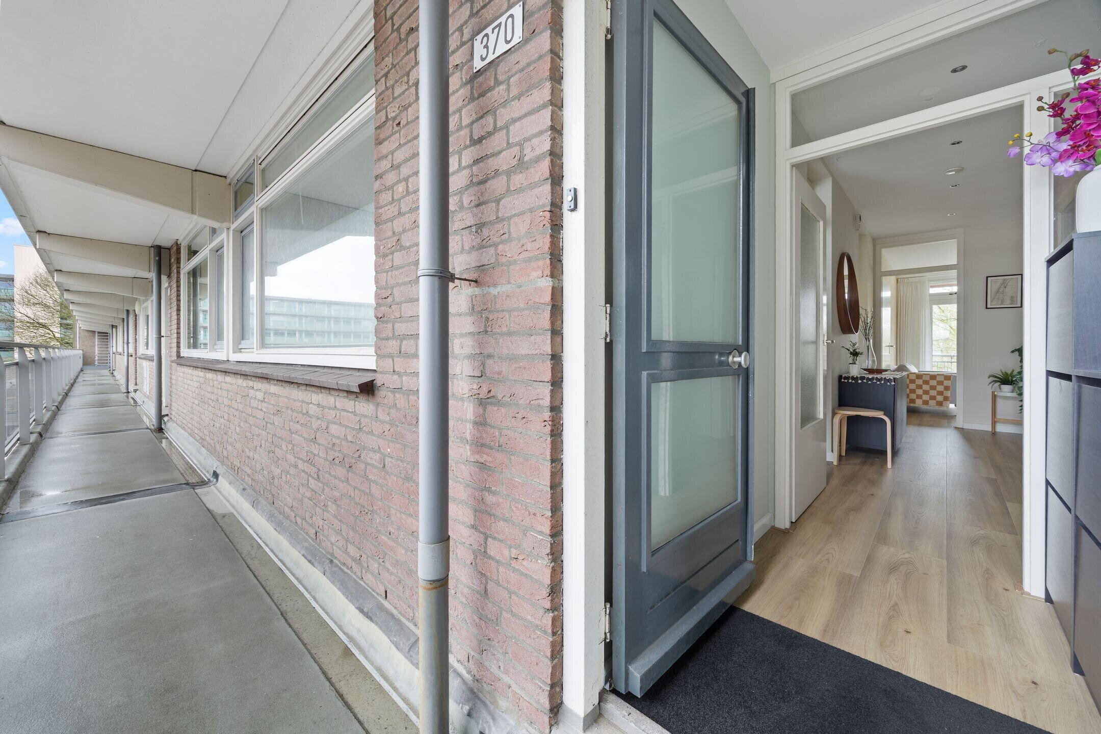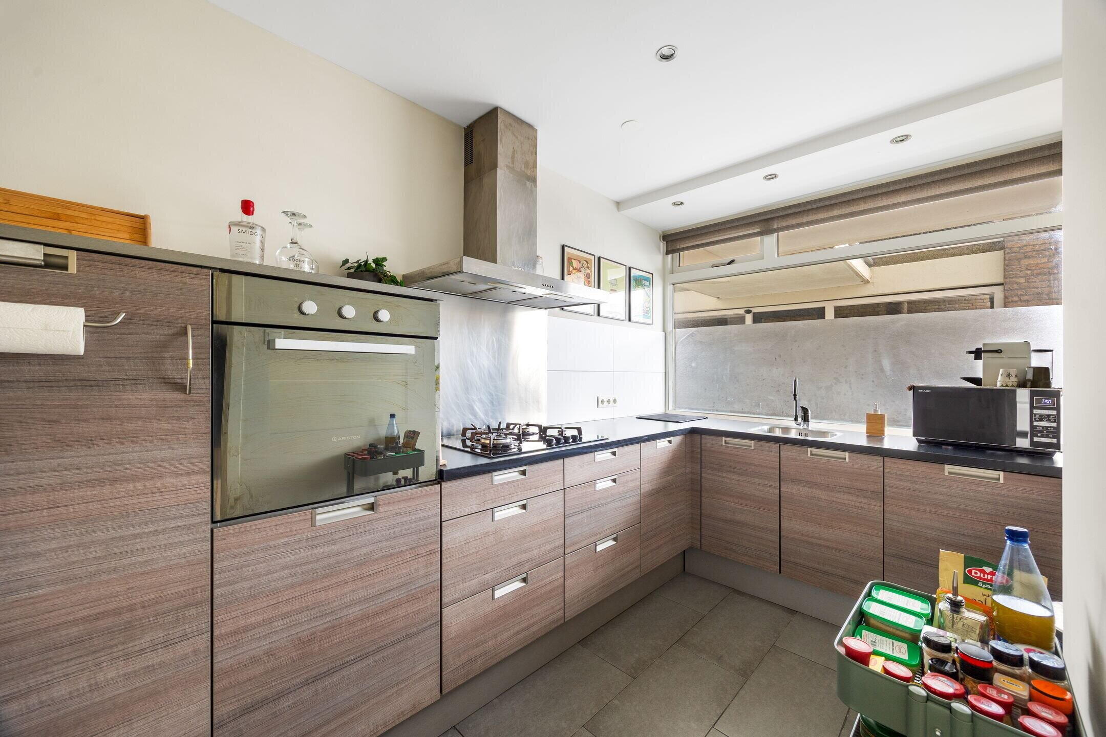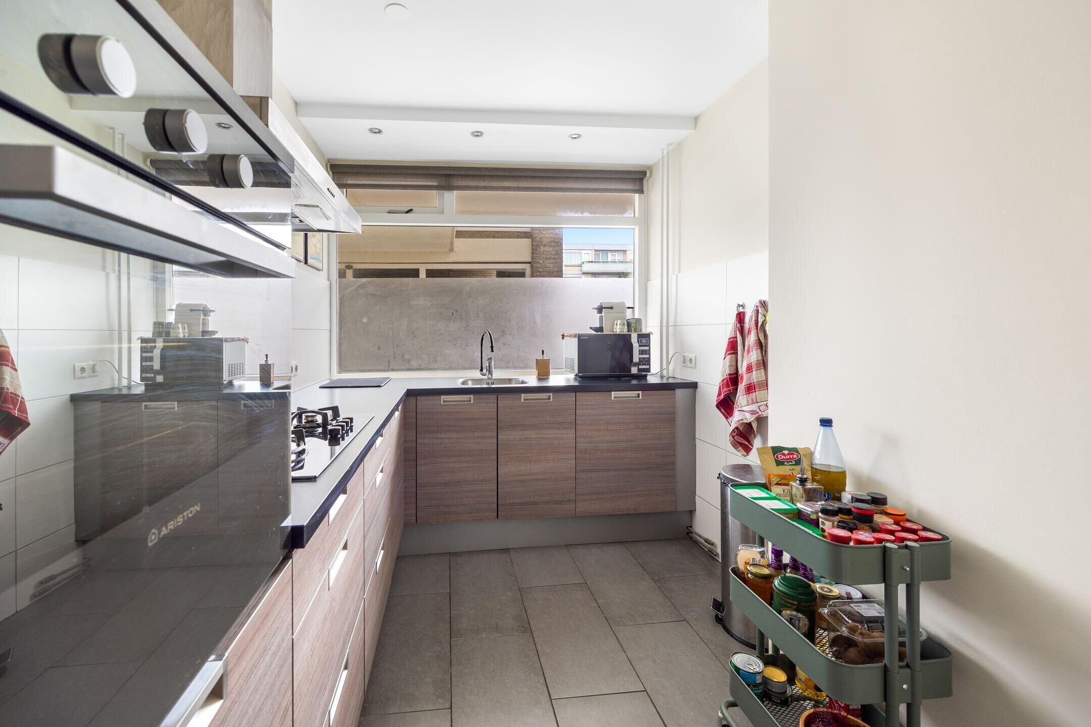 Gemeenschappelijke entreehal met brievenbussen en bellentableau op de begane grond, trap of lift naar de derde verdieping, galerij, entree appartement. Entreehal en lekker brede centrale gang, waarop alle ruimtes uitkomen. Aan de galerijzijde gelegen keuken met modern keukenblok in l-opstelling en voorzien van diverse inbouwapparatuur waaronder een gaskookplaat, afzuigschouw, koelkast, vriezer en afwasmachine.